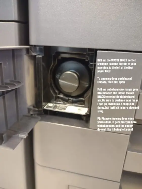 What happens if I don’t change the waste toner? Well, in most cases, the machine will detect that you did not change the bottle, and will alert you through an error message. If the bottle becomes completely full, it will stop all operations until it is changed. In some rare cases, it can cause the waste toner to back up into the machine, necessitating a technician visit to clean it out, and can also result in the need to replace components of the machine. Either way, staying on top of this toner bottle cycle can save you a massive headache. Ask me how I know! To help you spread this knowledge, feel free to print and post this handy little flyer on or near your copier!